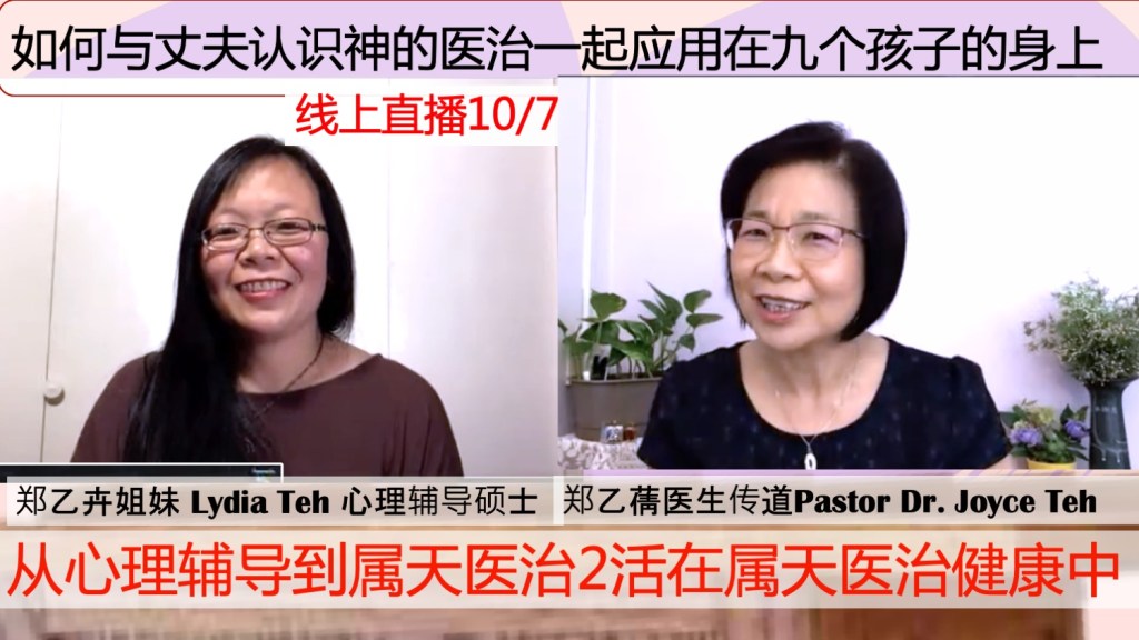 心理辅导硕士属天医治最新网上直播,欢迎大家观赏! 线上直播:26.6.2021 从心理辅导到属天医治 第二集 郑乙卉姐妹分享:如何认识神的医治及与先生一起应用在九个孩子的身上!活在属天医治与健康之中!https://youtu.be/hFqSO4_gH84