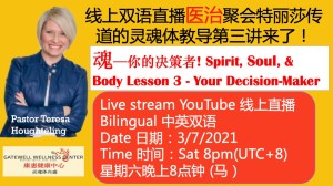 Health Teaching on Spirit Soul and Body (three part series) Lesson Three “Your Soul — The Decision – Maker 郑乙蒨传道(医生) Dr Joyce Teh (MD) 会现场翻译中文