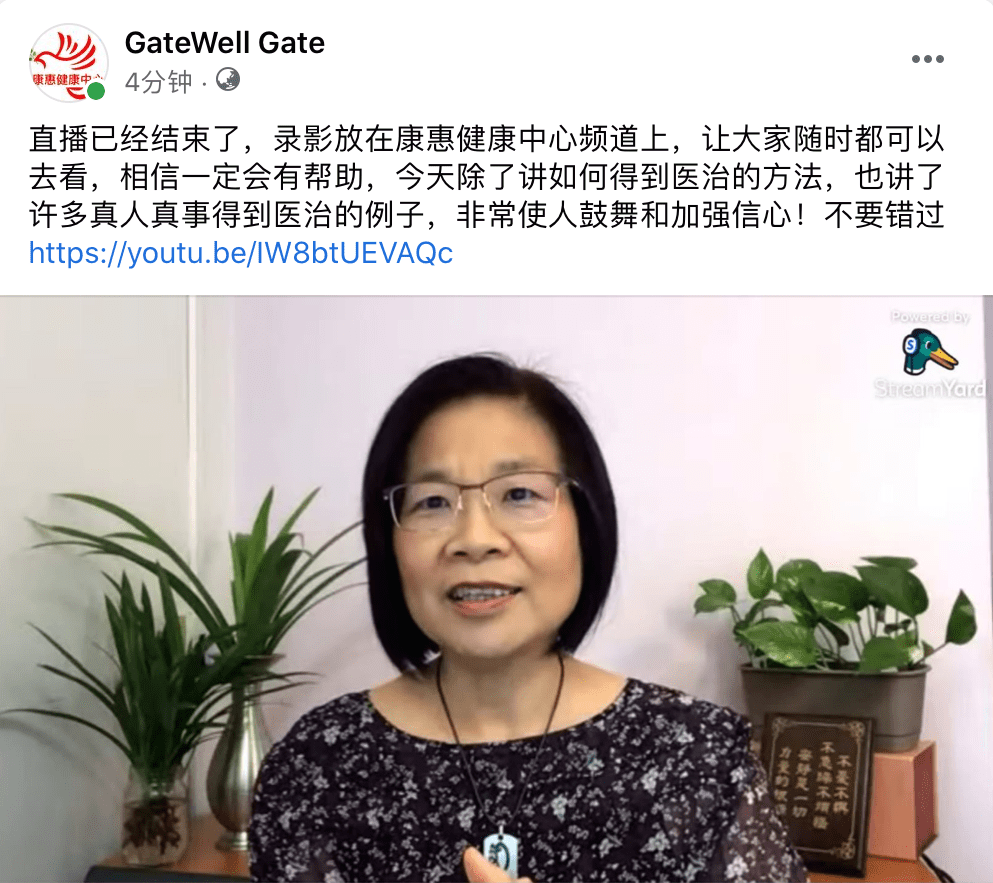 直播已经结束了,录影放在康惠健康中心频道上,让大家随时都可以去看,相信一定会有帮助,今天除了讲如何得到医治的方法,也讲了许多真人真事得到医治的例子,非常使人鼓舞和加强信心!不要错过! https://youtu.be/IW8btUEVAQc