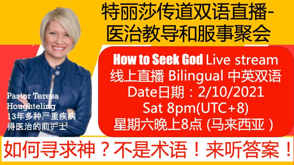安德烈渥迈克恩典圣经学院毕业的特丽莎传道的医治教导2021-10-02 星期六晚8pm(UTC+8)线上直播又来了题目“How to seek God?” “如何寻求神”医治教导和服事-这一回要讲什么属天医治秘诀?PastorTeresa Houghteling13年严重疾病得医治的前护士和 Dr. Joyce Teh(MD) 郑乙蒨医生传道要与你分享 [https://youtu.be/DywNgQVJCP4]