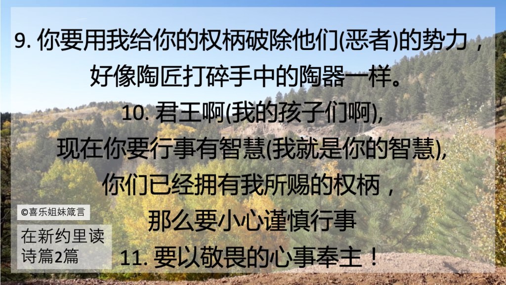 9. 你要用我给你的权柄破除他们(恶者)的势力,