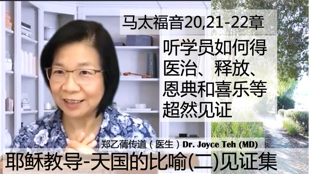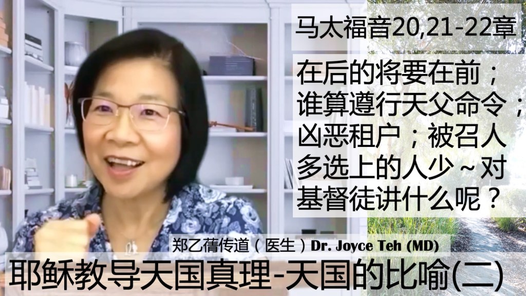 主耶稣在马太福音用许多比喻讲解天国的信息。祂说在后的将要在前;谁算遵行天父命令;凶恶租户;被召人多选上的人少~对基督徒讲了什么呢?鼓励大家去听郑医生传道讲解这非常重要的精华信息,关于耶稣用天国比喻讲了什么?对基督徒说的吗?我们要知道和明白啊!
