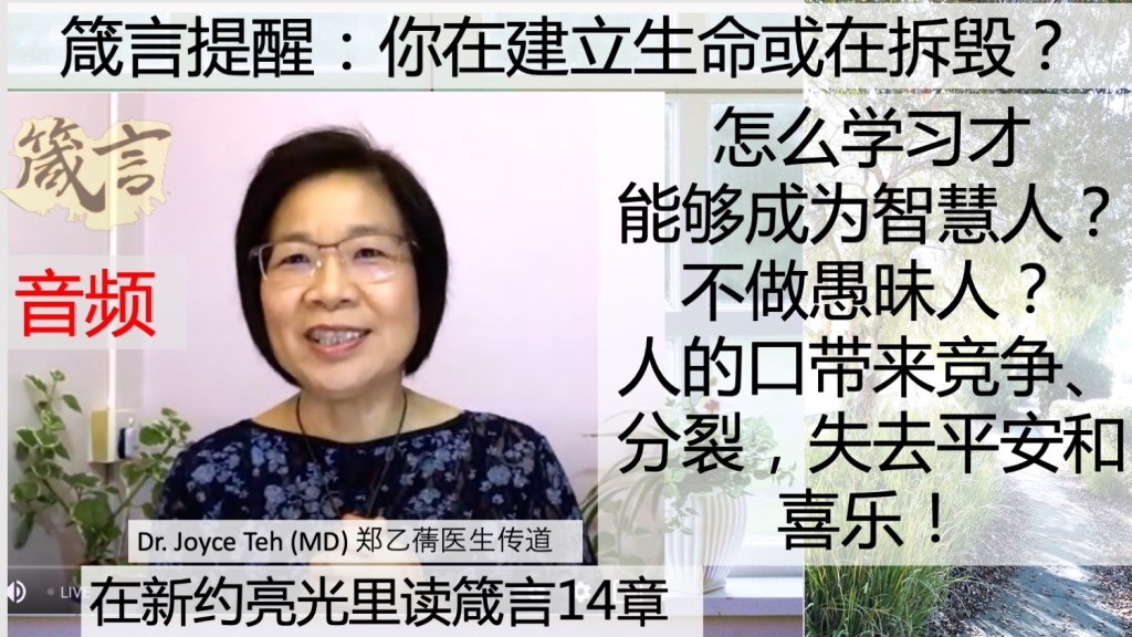 以下是箴言14章的音频链接:【https://youtu.be/1QexIBMKtgA】鼓励大家去听郑乙蒨医生传道在新约亮光里的讲解。