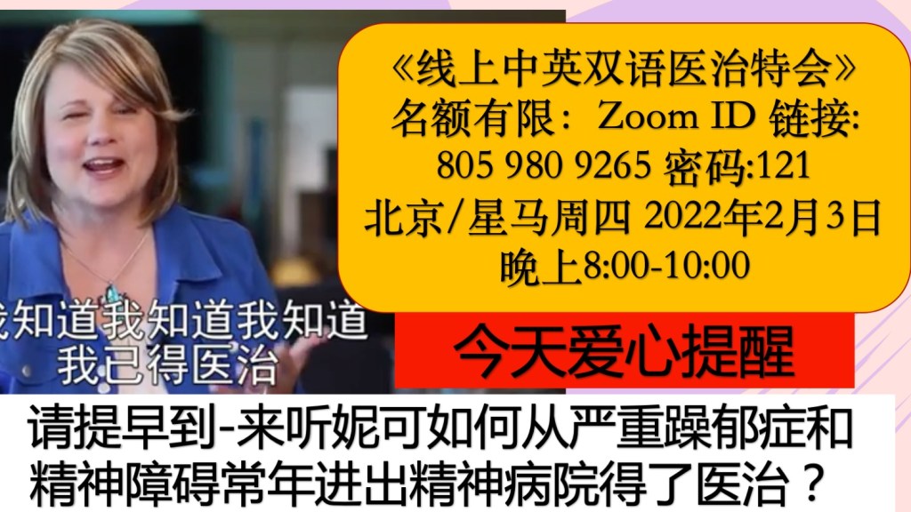 请今天爱心提醒:记得今晚第一场!Nichole Marbach妮可:从严重躁郁症、各种精神障碍常年进出精神病院 – 得医治!名额有限,我们集中邀请听中文的弟兄姐妹,请大家提早入场!欢迎广为宣传,邀请亲朋好友新年里一起来领受神的大礼包-得医治! 记得时间和密码啊!