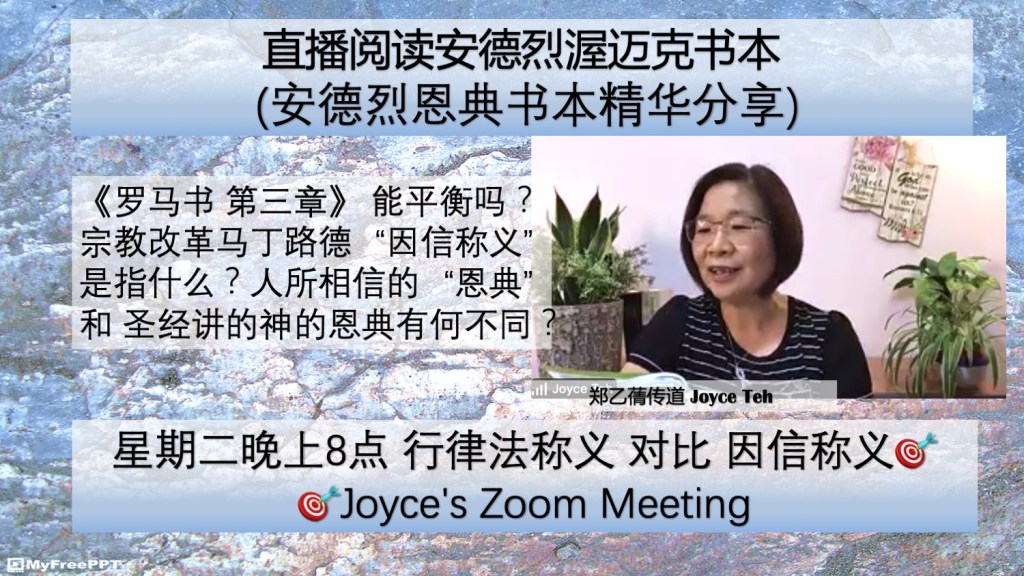 直播了,请你到这链接看录影视频:《罗马书 第三章》 能平衡吗?行律法称义 对比 因信称义 – 恩典的杰作《安德烈书本分享》 郑乙蒨传道 Joyce Teh 2022年3月1日 北京/星马/港台时间 晚上八点 https://youtu.be/xjGrDJCoLD0