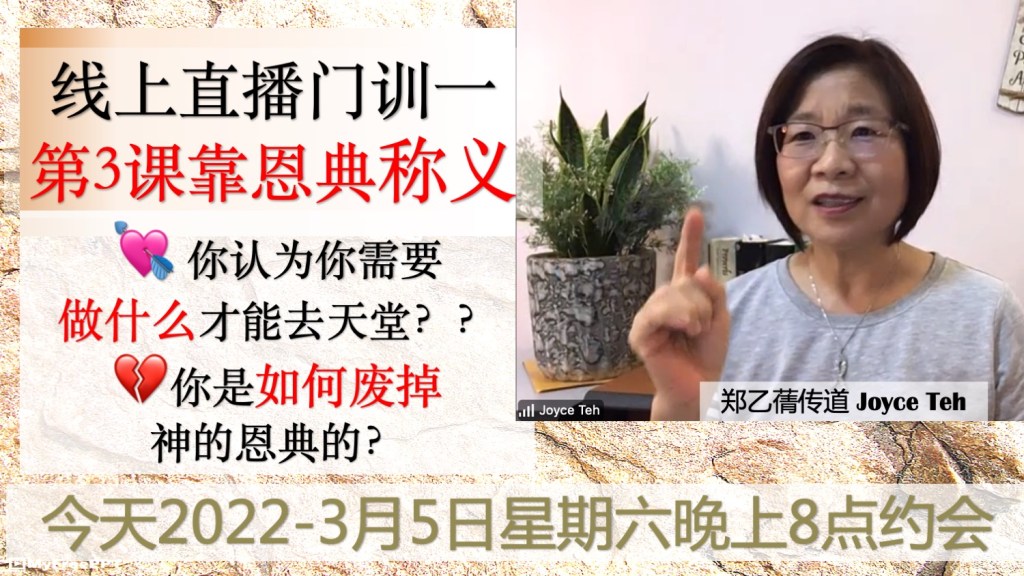 线上直播门训一第3课靠恩典称义(采用安德烈渥迈克DE门训课程)ZOOM和油管直播同时进行每星期六晚上8点北京/港台/星马同样时间。邀请新朋友来!也欢迎去油管YouTube看同时进行的直播!内容关乎人生最重要的事:譬如:你认为你需要做什么才能去天堂??你是如何废掉神的恩典的?