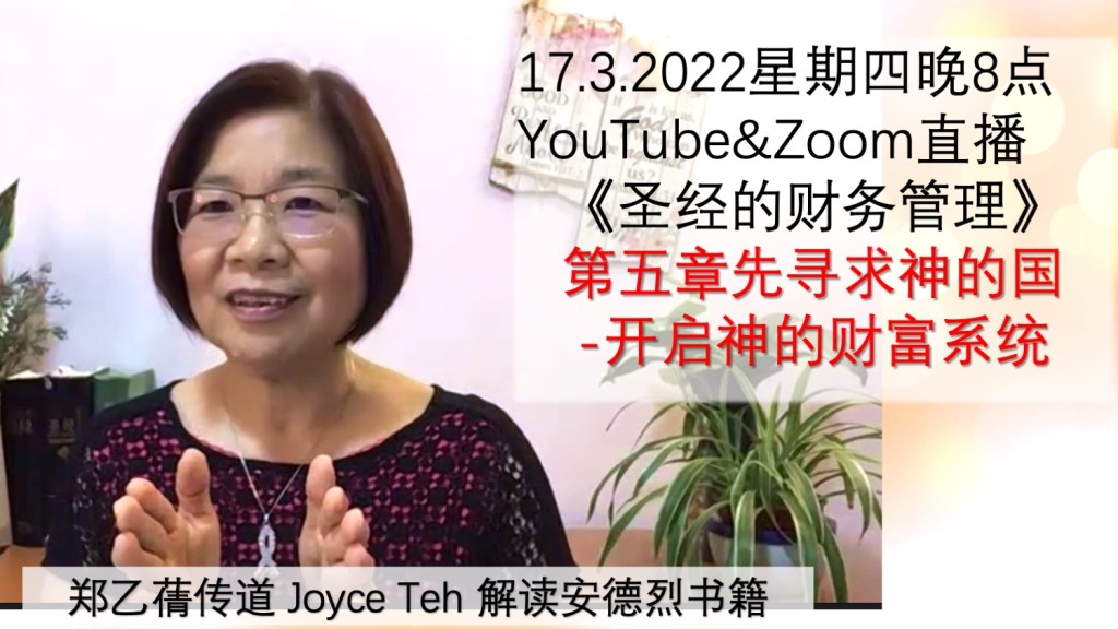 17.3.2022星期四晚8点(北京/港台/星马时间)通过油管YouTube,和用Zoom聚会直播《圣经的财务管理》第五章先寻求神的国-开启神的财富系统