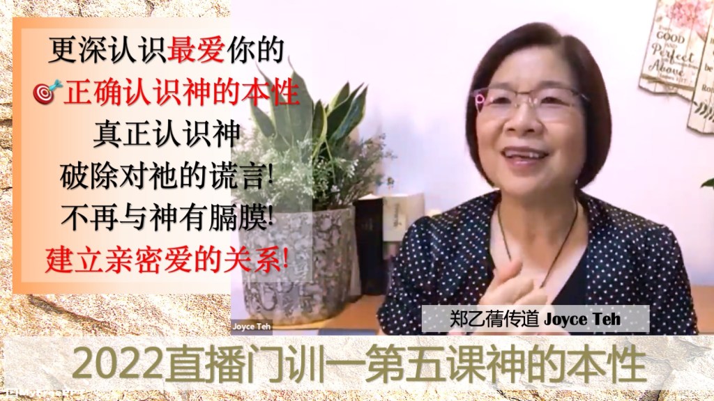 以下这课是关于 正确认识神的本性,才不致相信谎言使你与神分开! 🎯 来真正的认识神,破除对他的谎言! 享受与父、与主亲密爱的关系! 🎯Joyce 的 Zoom 门训Zoom 账号: 971 761 1158🎯Passcode密码: 1 圣经罗马书5:8说,当你还是罪人的时候,耶稣为你而死,神的爱在此向你显 明了。所以新约教导我们,神不是在你洁净了自己的行为后才爱你,而是在你还是罪 人的时候就爱你了。。。鼓励你参加直播听下去,这是真的吗?什么意思?郑乙蒨传道 Joyce Teh 讲解