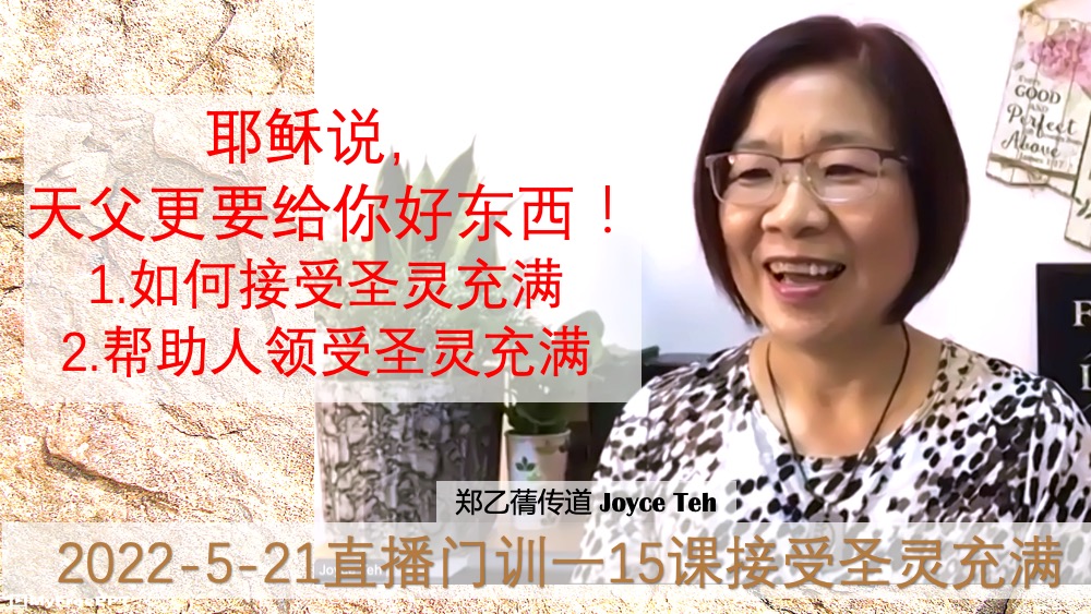 注意:下一课圣灵充满的许多好处2022-05-28晚上8点北京/港台/星马时间:请你准时进入Joyce门训Zoom 账号: 971 761 1158 Passcode密码: 1(通常7:50就开放)鼓励大家参与直播的Zoom组,因为上课的下半部(没有录影或录音)是开放给现场发问和解答,也给参与者分享当天课程心得,和为有需要者祷告!