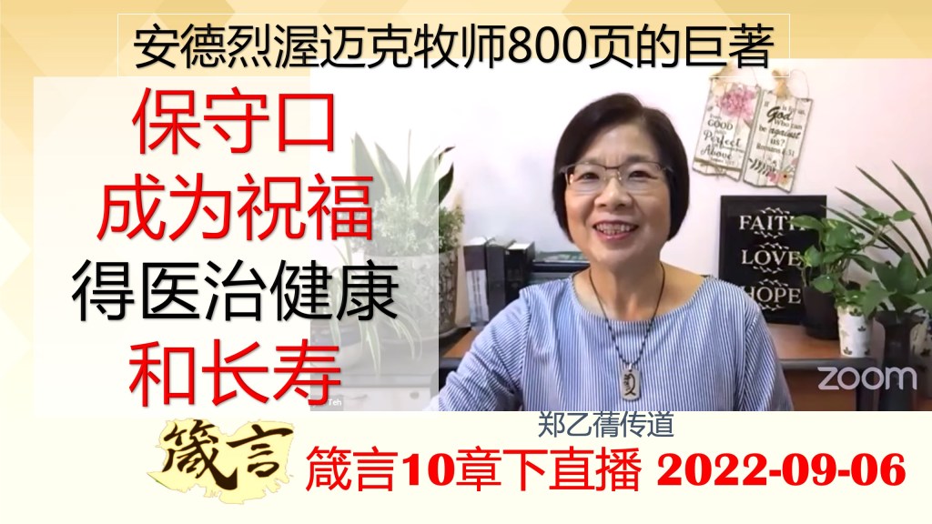 箴言 10:22 耶和华的福,叫人富足,不加忧虑。申命记 28:1-14 许多来自神的祝福。箴言10:21 义人的口教养多人!言语会给我们带来麻烦(箴言 10:19),但正直人会使用言语的力量!直播又来了!箴言第10章(下)保守口得医治—带出健康生命和长寿!《安德烈牧师巨著》郑乙蒨传道分享 2022-09-06 晚上7:50北京/港台/星马时间(美东/加拿大东部时间早上7:50)
