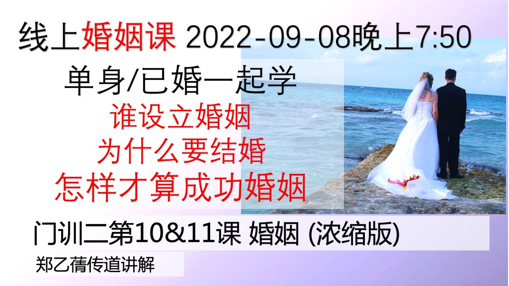 谁设立婚姻?婚姻的目的?为什么要结婚?如何才算成功的婚姻?单身已婚都要学习! 2022-09-08日门训二第10&11课婚姻(浓缩版)(油管没有直播),很多机会给大家发言和讨论!鼓励参加Zoom线上课室(点击链接,用密码 1 进入)北京/港台/星马晚上7:50;美东/加拿大东部早上7:50)通常8点准时开始教课,9点-10点让大家发言/讨论/接受祷告和服事