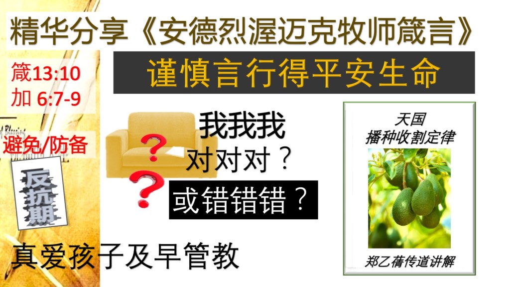 2 分钟解答:明白《天国定律:撒种与收获》,谨慎言行,得平安生命!《加拉太书6:7,8,9》 《安德烈牧师巨著》 郑乙蒨传道分享 20221018:https://youtu.be/H29DzX8SaBk