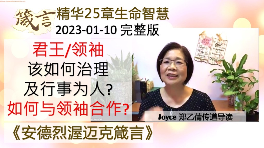 鼓励那天YouTube只看到一半就被中断直播(24分钟)的家人们继续看这完整版:Joyce传道挽救回来的完整版箴言25章智慧管理学!会说话就无价!该如何治理及纠正人? 被人纠正觉得不同意怎样和治理人沟通? 天国智慧精华分享《箴言 – 安德烈牧师巨著》郑乙蒨传道导读 2023-01-10