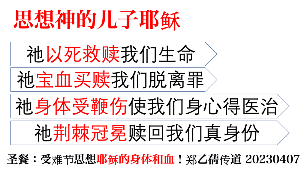祂是神的儿子。祂以死救赎我们生命,祂以宝血买赎我们脱离罪,祂以身体承受鞭伤极大的痛楚使我们的身体和心(包括精神)和其他捆绑都得了医治,祂戴荆棘冠冕为赎回我们的真身份!祂就是耶稣,我们的救主,我们的主!