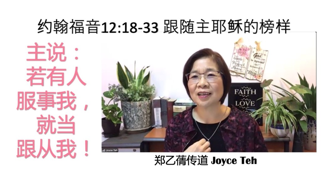 音频1: 约翰福音12:18-33 跟随主耶稣的榜样 郑乙蒨传道 Dr. JoyceTeh :主说:若有人服事我,就当跟从我! 20-09-05:https://youtu.be/9TxQ5S08IOQ