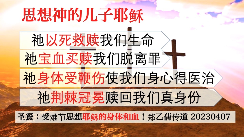 特别推荐这最后一课:听郑乙蒨传道 2023-04-07 带领最后在世记念耶稣受难节的圣餐。讲解这耶稣受难的圣餐意义和领受身体、心灵(包括破碎的心)和一切需要的医治、释放和修复的祷告。