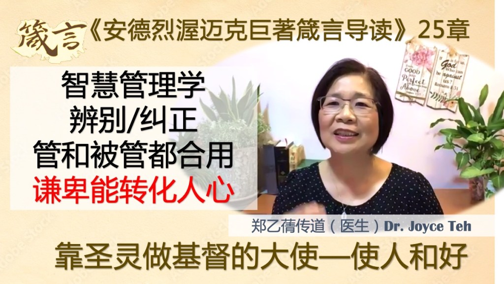 (2023-01-10)箴言25章完整版 智慧人事管理一定要学!会说话实在无价!从新约亮光教你正确处理和纠正人的艺术!要这样治理和被治理来达到共同目标!《箴言 – 安德烈牧师巨著》郑乙蒨传道导读 2023-01-10 大前提提醒:我们仍然从新约亮光来读箴言智慧书!谦卑能转化人心,管理人或被人管理都合用!记得我们是基督的大使,带入与神和好。这一章包括许多教导正确说话和正确处理人事的教导。安牧师也分享了他本身的例子。https://youtu.be/sEgPEWeOS48