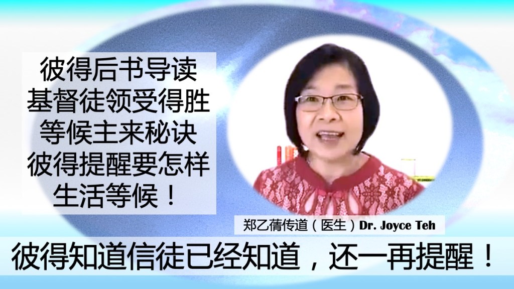 基督徒领受得胜等候主再来的秘诀——知道已经拥有什么和使徒们一样宝贵的?为什么使徒彼得还要在离世前一再提醒我们?彼得后书导读- 郑乙蒨传道(医生)Dr Joyce Teh 201212 https://youtu.be/W6rD4fwMR8U