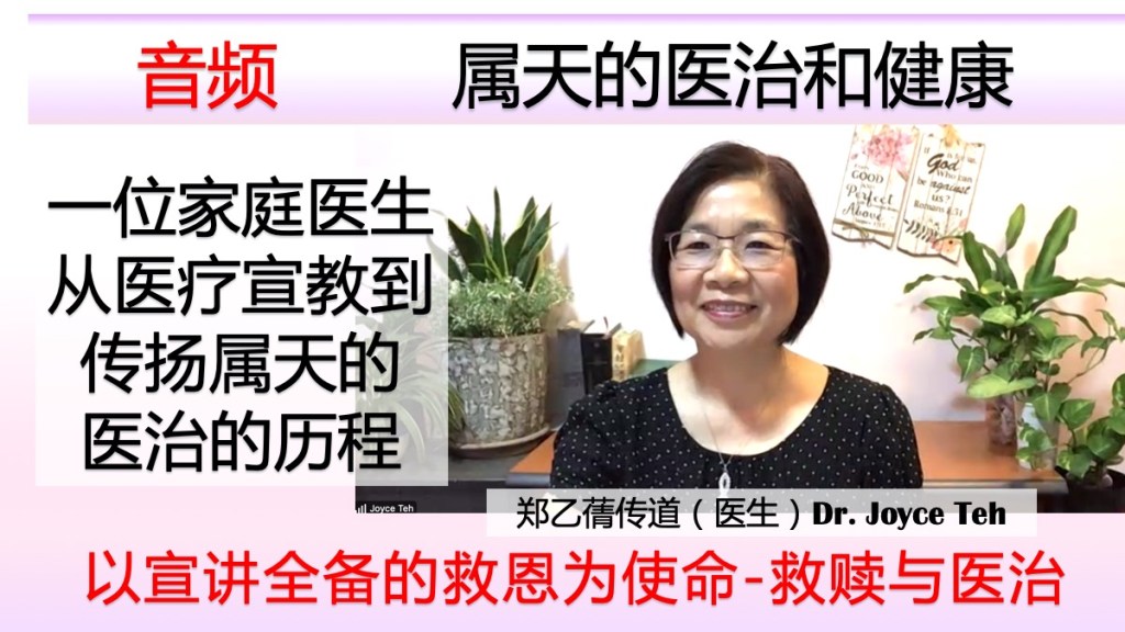 强力推荐(六集音频):属天的医治和健康!从医疗宣教到传扬属天的医治 郑乙蒨传道 (医生) Dr Joyce Teh 18.2.2020 https://youtu.be/Q2iH67EuGWg