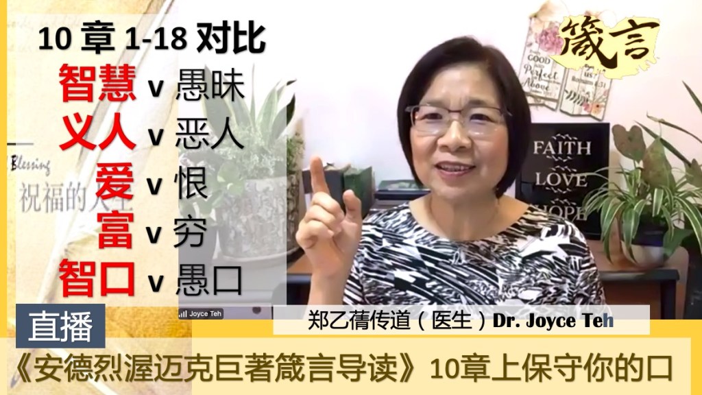 箴言第10章(上) 保守口得医治—带出健康生命和长寿看永恒! 五大对比的选择!《安德烈牧师巨著》郑乙蒨传道(医生)Dr. Joyce Teh 导读分享 20220830