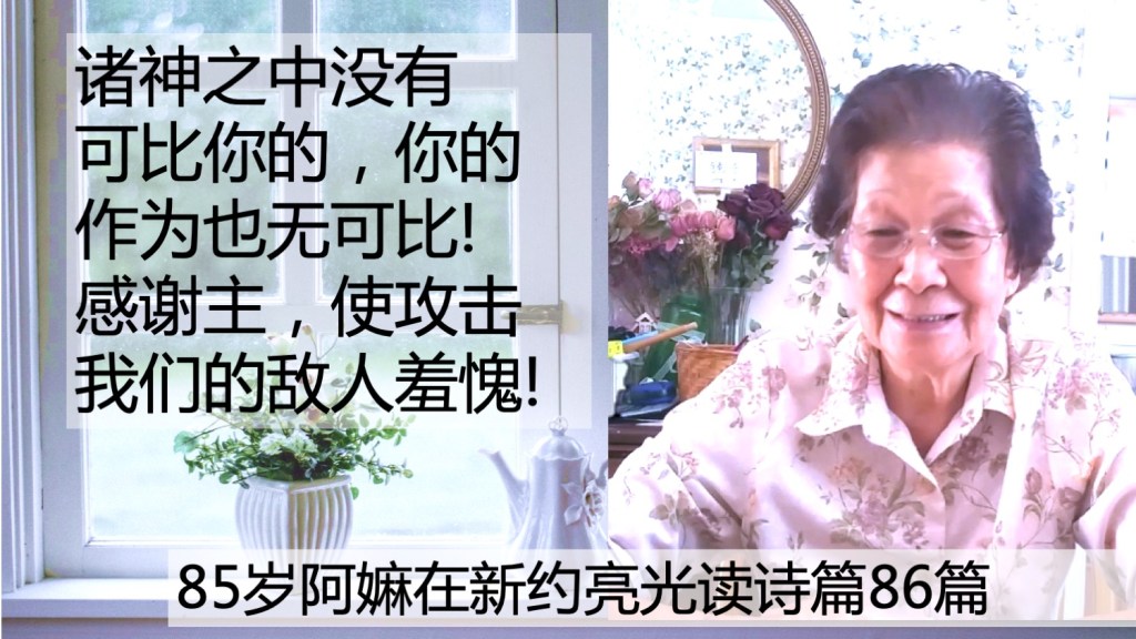 86 耶和华啊!求(感谢)你留心听我、应允我, 因为我是困苦贫穷的。(本节在《马索拉文本》包括细字标题) 2 求(感谢)你保护我的性命,因为我是虔诚的人; 我的 神啊!求(感谢)你拯救这倚靠你的仆人。 3 主啊!求你恩待我, 因为我终日向你呼求。 4 主啊!求(感谢)你使你的仆人心里欢喜, 因为我的心仰望你。 5 主啊!你是良善,又乐意饶恕人的, 向你呼求的,你都以丰盛的慈爱待他们。 6 耶和华啊!求(感谢)你侧耳听我的祷告, 留心听我的恳求(感谢)。 7 在我遭难的日子,我要求告你, 因为你必应允我。 8 主啊!在众神之中,没有能和你相比的, 你的作为也是无可比拟的。 9 主啊!你所造的万国都要来,在你面前下拜, 他们必荣耀你的名。 10 因为你是伟大的,并且行奇妙的事, 只有你是 神。 11 耶和华啊!求(感谢)你把你的道路指教我, 使我行在你的真理中, 专心敬畏你的名。 12 主我的 神啊!我要满心称赞你, 我要永远荣耀你的名。 13 因为你向我大施慈爱, 你救了我的命,免入阴间的深处。 14 神啊!骄傲的人起来攻击我, 一群强暴的人寻索我的性命, 他们不把你放在眼内。 15 但是,主啊!你是有怜悯有恩典的 神, 你不轻易发怒,并且有极大的慈爱和信实。 16 求(感谢)你转向我,恩待我; 把你的能力赐给你的仆人, 拯救你的孩子(在基督里的儿女)。 17 求(感谢)你向我显出恩待我的记号, 好使恨我的人看见了,就觉得羞愧; 因为你耶和华帮助了我,安慰了我。