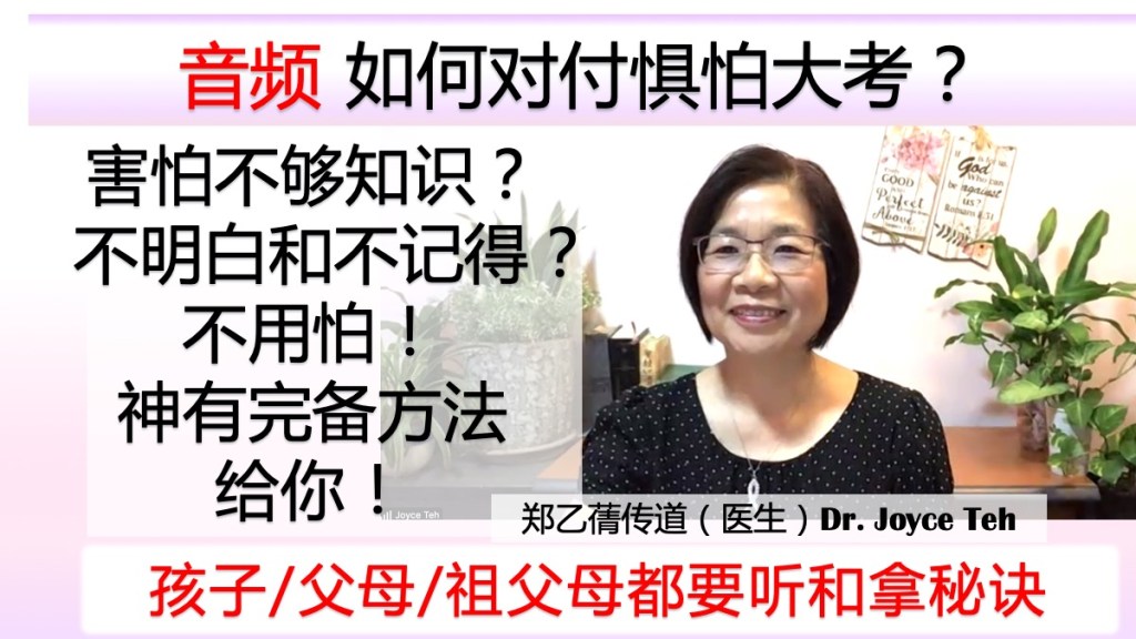 (一)每个人都惧怕考试!包括父母和祖父母都惧怕!在惧怕里没有办法好好发挥果效!这集短短分享和教导会帮助你在这人生必经环节得胜有余!来学习如何不怕考试!秘诀是懂得如何依靠神来学习!什么是正确的心态和学习态度?郑乙蒨传道(医生) Dr Joyce Teh 200704 简要分享她台大医学系第四年亲身的经历!她也会简要讲解一些切实具体的方法,如何应用属灵的供应!她也为你和孩子祷告!孩子和父母(甚至祖父母)都要学习和经历!