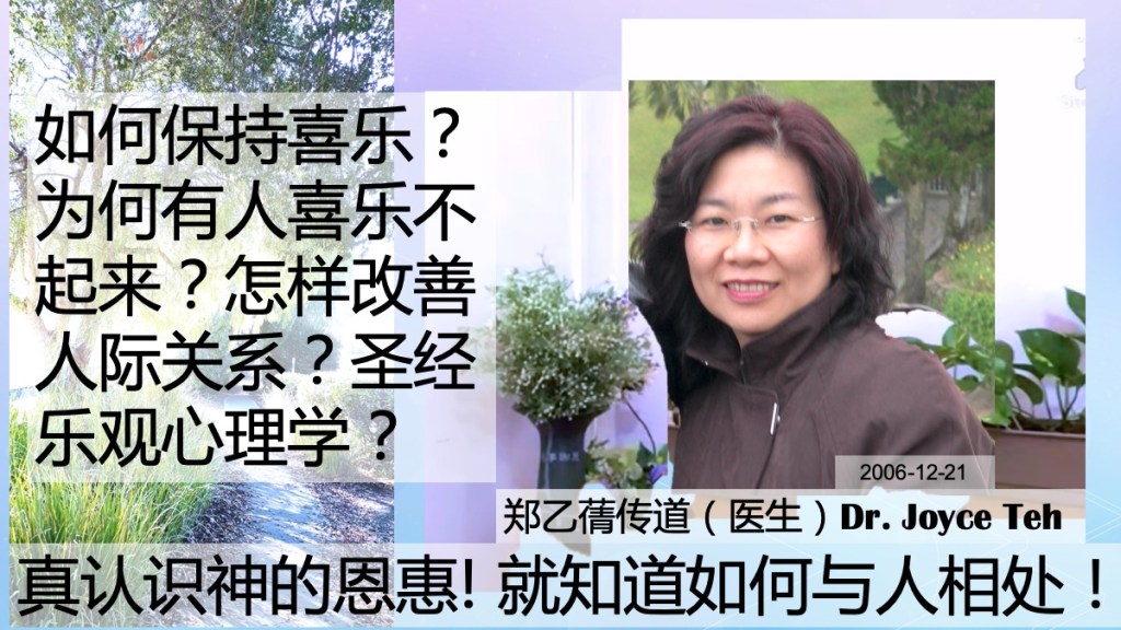 推荐:这用圣经心理想法和行为言语配合课是郑传道在2020年教导基督徒从神的话看“乐观心理学” 。如何保持喜乐?常常喜乐!怎么可能?为什么有人喜乐不起来?怎样改善人际关系?怎样保守口和心?郑乙蒨传道(医生 )Dr Joyce Teh 在当时2020年的疫情时期 2020-09-12 第一次在线上讲。她后来在 2022-07-02 看见新的需要又讲了同样主题。为什么讲了超过一次?通常她灵里感动,看见有需要,就讲了,不论多少次!这课题是许多人都需要听到的!我们鼓励大家都听两个版本!也介绍给其他有需要的人。郑传道本身多年行医已经实用帮助了许多这方面有需要的人。