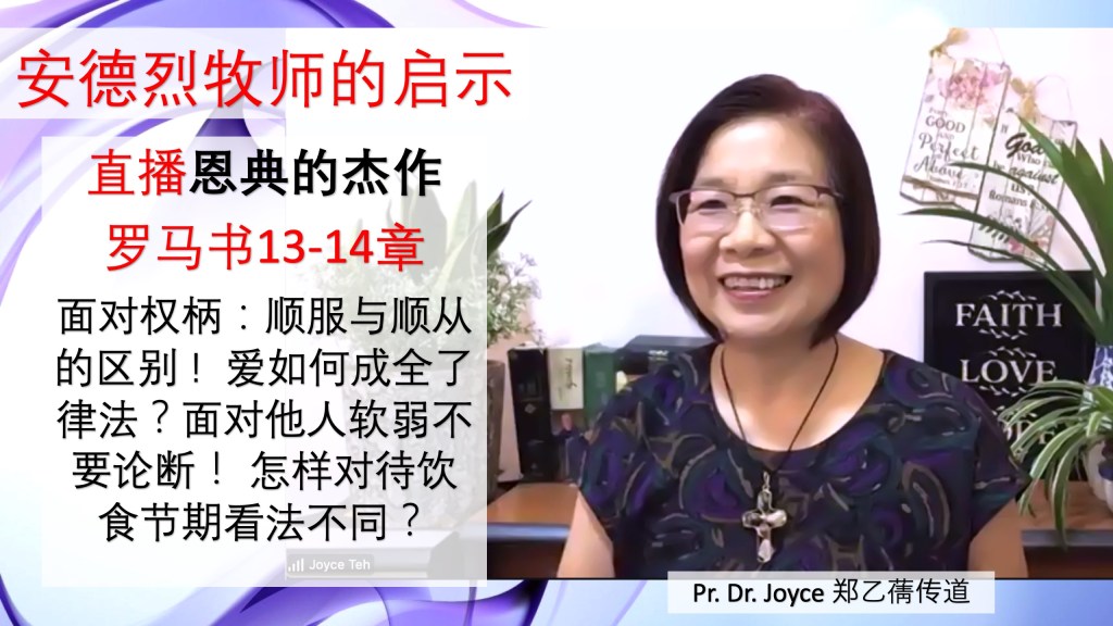 《罗马书 13-14章》 面对人犯罪,如何应对和处理?面对人的权柄,不悖逆—顺服和顺从有区别!面对人的软弱,怎样正待饮食节期而不论断?《恩典的杰作 – 安德烈巨著》郑乙蒨传道Dr.Joyce Teh 读书分享