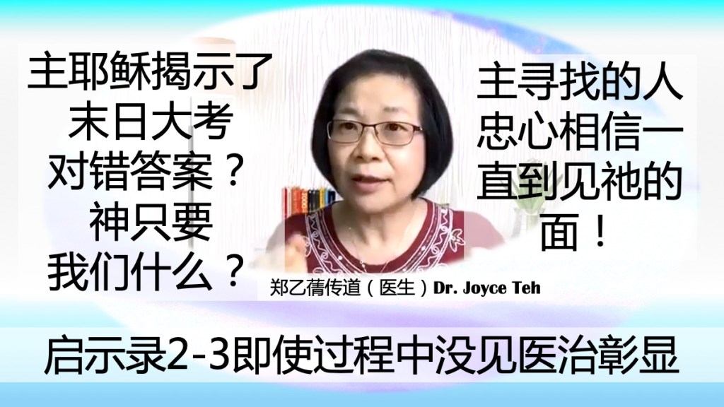 启示录2-3章:主耶稣揭示的大考答案 – 指出两个正确和五个错误的答案 !神要我们选择什么呢?都在这本书!郑乙蒨传道(医生)Dr Joyce Teh 200808 分享:https://youtu.be/zDCu8u2vOTo (影片)